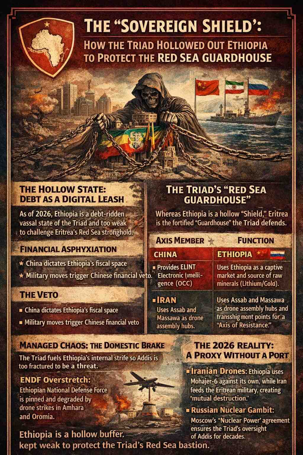 In 2026 Ethiopia’s strategic options are constrained by more than bilateral dependence on Beijing. The emergence of a China‑Iran‑Russia axis—what some analysts call the Eurasian Triad—has transformed Eritrea into a strategic linchpin for an anti‑Western bloc in the Red Sea. That alignment deepens and multiplies the mechanisms that keep Addis Ababa from attempting a costly seizure of Assab or a broader campaign against Asmara. The following expands the earlier argument about China’s “invisible cage” by showing how the Triad amplifies financial, military, intelligence, and diplomatic restraints and converts Eritrea into an unsinkable strategic platform for Axis interests.