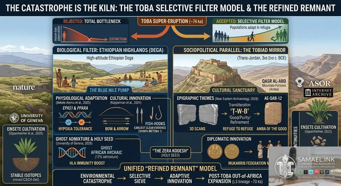 The 74 ka Toba super‑eruption has traditionally been framed as a near‑global bottleneck for Homo sapiens. Recent genomic, archaeological, and historiographic research (2024‑2026) replaces that narrative with a selective‑filter model: high‑altitude refugia in the Ethiopian Dega acted as ecological “pumps” that concentrated adaptable groups, while contemporaneous sociopolitical refuges in the Trans‑Jordan (the Tobiad dynasty) illustrate a parallel cultural filter. Integrating whole‑genome sequencing of L3 mitochondrial lineages, microlithic and bow‑and‑arrow assemblages from Shinfa‑Metema 1, and epigraphic analyses of Tobiad inscriptions, we argue that environmental stress coupled with technological and diplomatic innovation drove the emergence of a “refined remnant” that seeded later Out‑of‑Africa expansions and preserved a distinct Semitic identity.