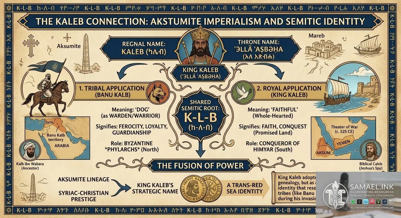 In The Throne of Adulis, Glen Bowersock argues that Kaleb’s naming was a form of "Scriptural Geopolitics." The Biblical Caleb (Hebrew: כָּלֵב, romanized: Kālēv) was the spy who claimed the Promised Land. By taking this name, the King framed his invasion of Yemen as a "Return" to a Semitic inheritance. Scholars note that this shared Biblical reference point created a bridge between the Aksumite elite and the Christian segments of tribes like the Banu Kalb, who shared the same scriptures.